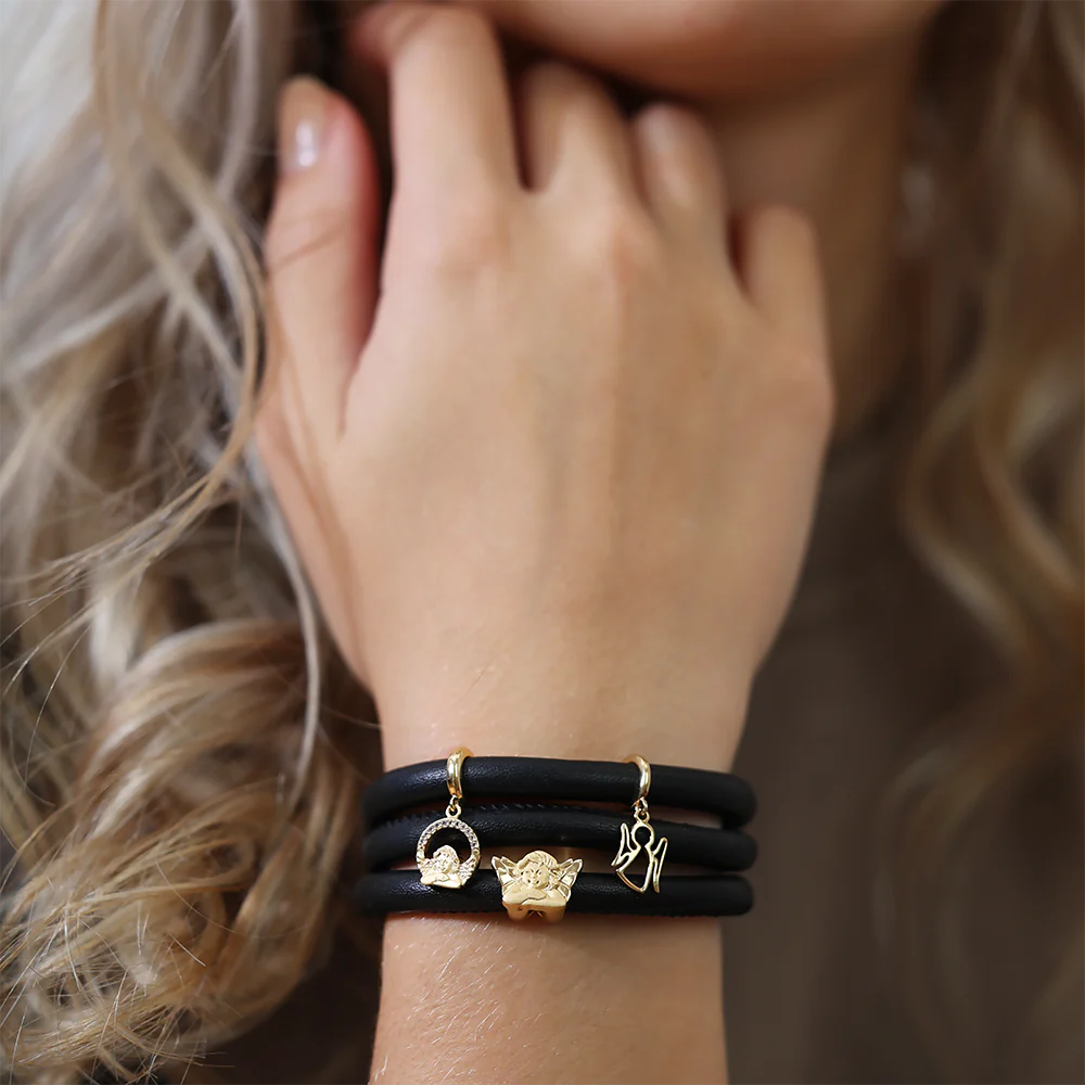 Vacker charm med en design av en skyddsängel silhuett. En skyddsängel är någon som är tänkt att skydda dig från allt ont. Använd även denna berlock som ett hänge till ditt halsband. Berlocken passar klassiska och 3-strängade läderarmband.