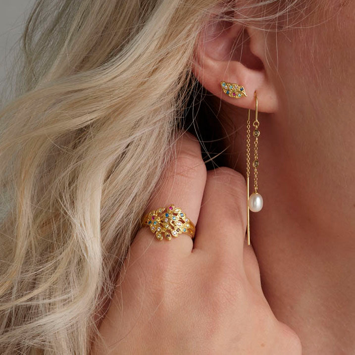 Denna eleganta påfågelring är en av våra absoluta favoriter. Ringen är gjord av 18 karats guldpläterat sterling silver och består av fina glittrande fjädrar, som är spridda brett över skenan med 21 färgade CZ som kompletterar den vackra designen.