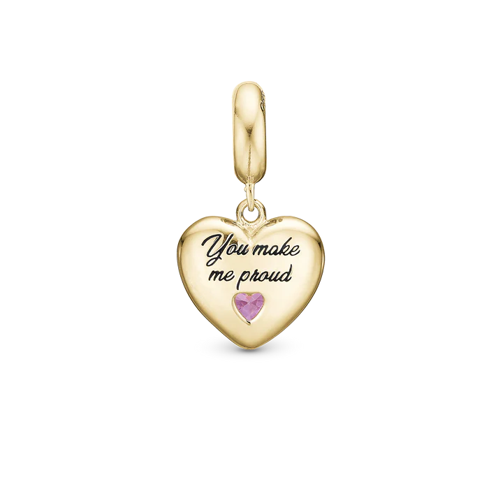Dotterberlocken är tillverkad i 18 karat guldpläterat sterling silver och har en gnistrande rosa turmalin. Daughter-berlocken är en tvåsidig skönhet, med Daughter ingraverad på framsidan och You Make Me Proud på baksidan. Smycket strålar av kärlek, och är ett personligt smycke som du kan ge bort i present till en dotter du känner. Daughterberlocken passar till Slim läderarmband och Silverarmband, men även som ett hänge till dina halsband.