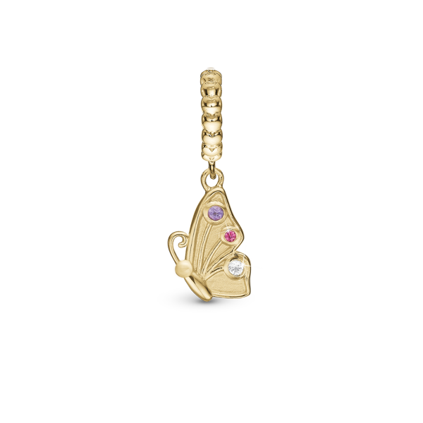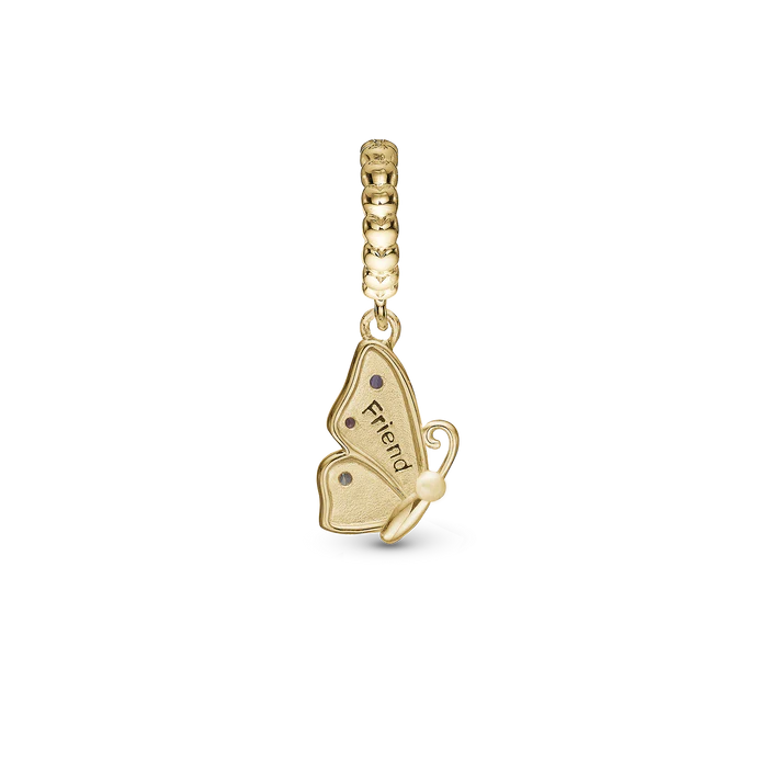 Fjärilen är en symbol för glädje och vår. Butterfly Friend är en av två charm, den andra är Butterfly True, och om du sätter ihop dem blir det True Friend. Detta innebär också en charm som du kan dela med någon du bryr dig om. Butterfly Friend berlocken är tillverkad i 18 karat guldpläterat sterling silver och är dekorerad med 3 Cubic Zirconia i lila, rosa och vitt, och graverad med Friend på baksidan av fjärilens vinge. Butterfly Friend-berlocken passar till Slim läderarmband och Silverarmband, men även som ett hänge till dina halsband.