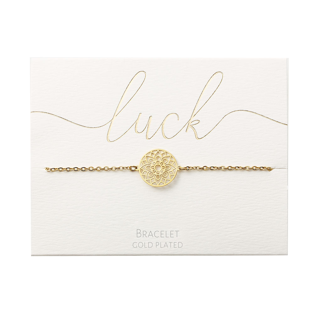 Guldpläterat stålarmband med Mandala of luck symbol. kan justeras från 17-20 cm för perfekt passform