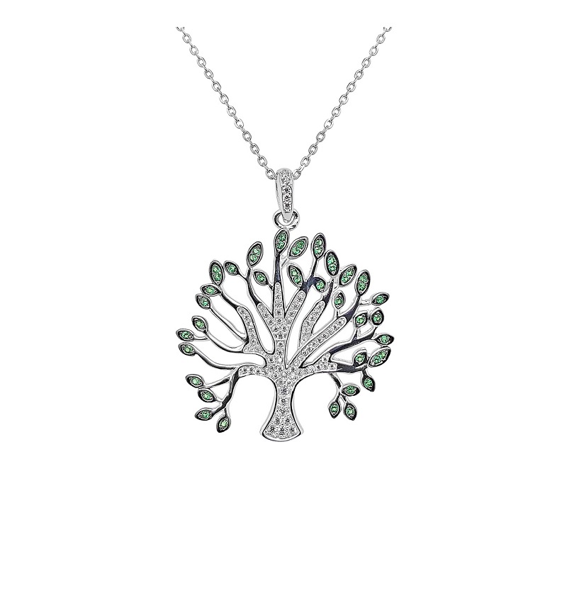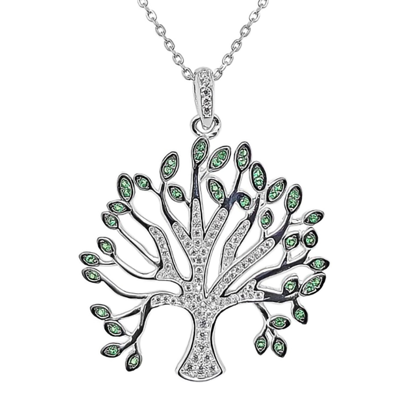 Tree of Life halsband i silver med zirconia stenar – 45 CM Halsbandet är gjort av 925 Silver och belagt med skyddande rodium. En rodiumbeläggning ger pjäsen en glänsande yta och ett utseende som vitt guld. Dessutom ger en rodiumbeläggning också fördelen att smyckena inte missfärgas och gör ytan mer hållbar. Livets träd är dekorerad med fina gröna och vita zirkonstenar.