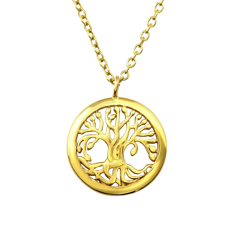 Tree of Life Halsband i 18 karat guldpläterat silver – 45 cm Söt och elegant Tree of Life halsband Guldpläterad. Halsbandet är gjort i 925 sterling silver och pläterat med 18 karats guld.Halsbandet har även polerats vilket ger halsbandet en extra läcker glans. Halsbandet Tree of Life har en kedjelängd på 45 cm. Kedjans diameter är 1 mm. Livets träd har en diameter på: Ø 13 mm