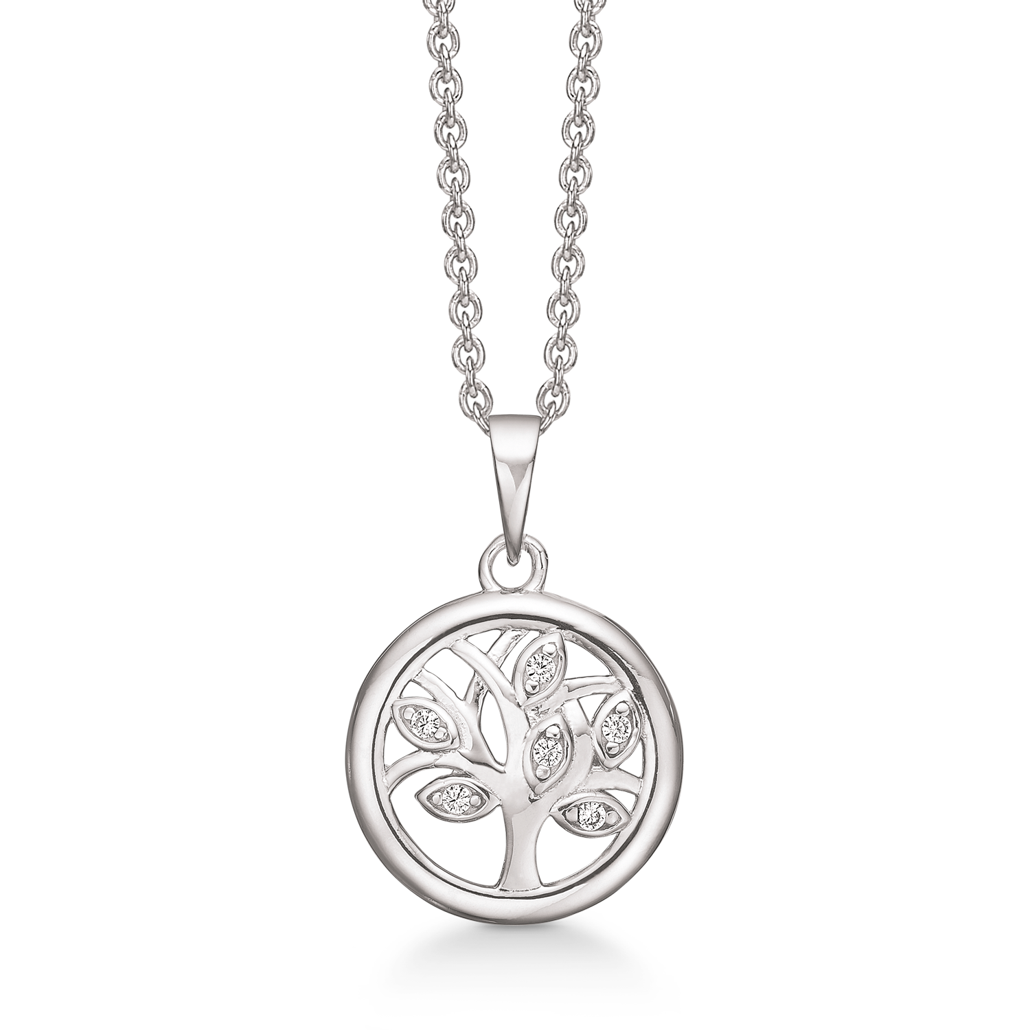 livets träd halsband i silver, med zirkonstenar – 42-45 cm livets träd halsband i silver, från danska Støvring. Halsbandet är belagt med skyddande rodium. En rodiumbeläggning ger pjäsen en glänsande yta och ett utseende som vitt guld. Dessutom ger en rodiumbeläggning också fördelen att smyckena inte missfärgas och gör ytan mer hållbar. Hänget är dekorerat med vita zirkonstenar. Halsbandet har en längd på 42-45 cm.