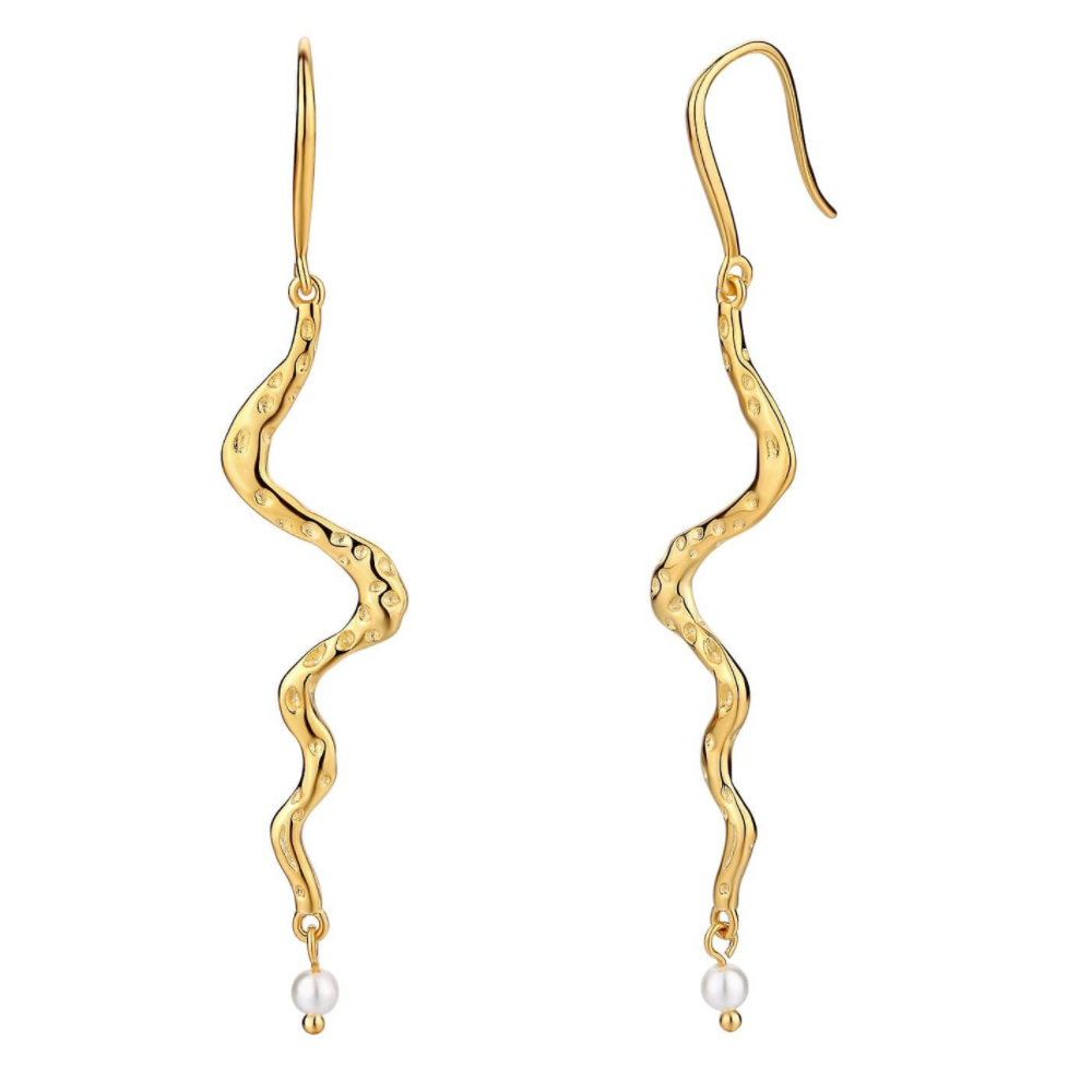 Alana Earrigns är ett större, längre örhänge, med förtrollande vågiga detaljer och en fin liten akvamarinpärla. Örhänget ger ett magiskt uttryck, och är det perfekta örhänget för att piffa upp vilken outfit som helst. Alana örhängen är en del av vår sjöjungfrukollektion, som är inspirerad av den magiska, lekfulla och förtrollande berättelsen om sjöjungfrur. Säljes som ett par. Material: 18K guldpläterad 925 sterling silver.Storlek: 6,5 cm Färg: Guld