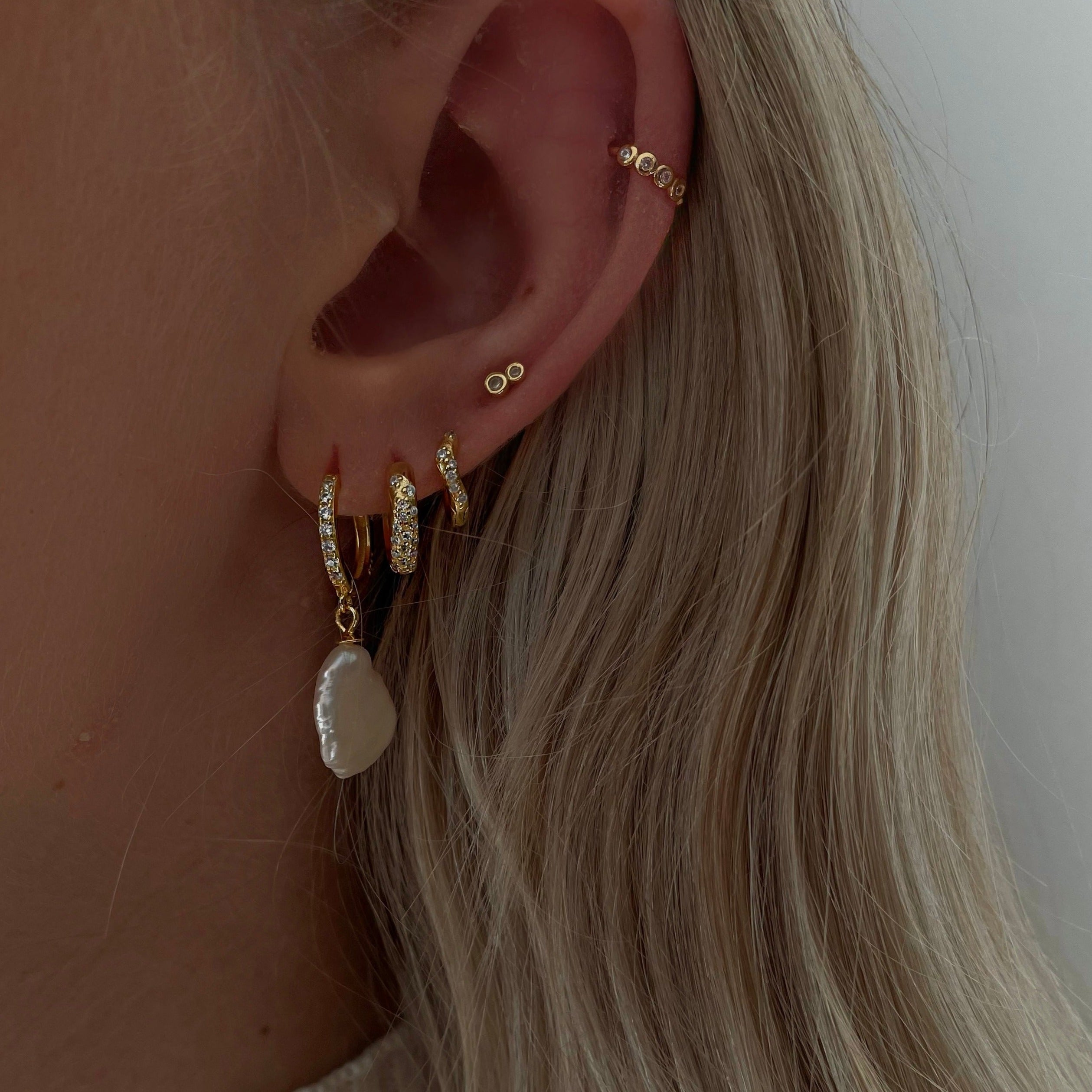 Celine Earrings är ett vackert och elegant huggieörhänge med en oregelbunden sötvattenspärla och klara cubic zirconia. Dessa bågar är lätta att ta av och på, eftersom de bara behöver klickas ihop runt örsnibben. Bär den ensam för en mer elegant look, eller styla den tillsammans med några av våra andra örhängen.. Observera att sötvattenspärlorna är naturliga och kan variera i form och storlek. Säljes som ett par. Material: 18K guldpläterad 925 sterling silver..Storlek: Bågediameter: 1,4 cm. Pärla: Ca. 1,5 cm. Färg: guld.
