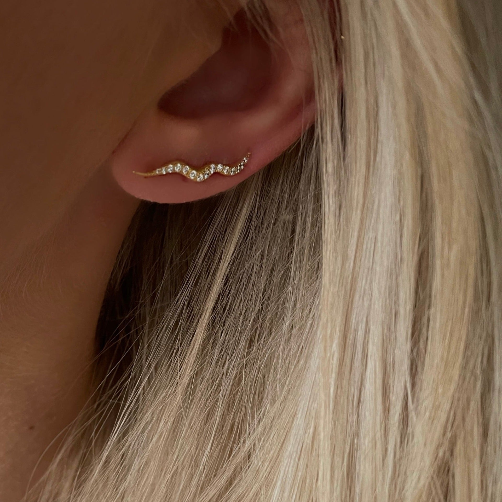 Esther Ear Climber är en förtrollande öronpropp som böljar sig längs örat. Örhängena är fyllda med klar cubic zirconia. Öronsnäckan har en längre dubb bak, vilket gör att den sitter längs med örsnibben. Esther Ear Climber är en del av vår Stargazing-kollektion, som är inspirerad av natthimlens många blinkande stjärnor.