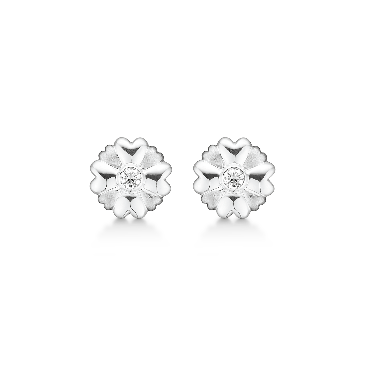 Silver öronproppar rodiumpläterade matt/blank blomma av hjärtan med facetterad zirkon.
