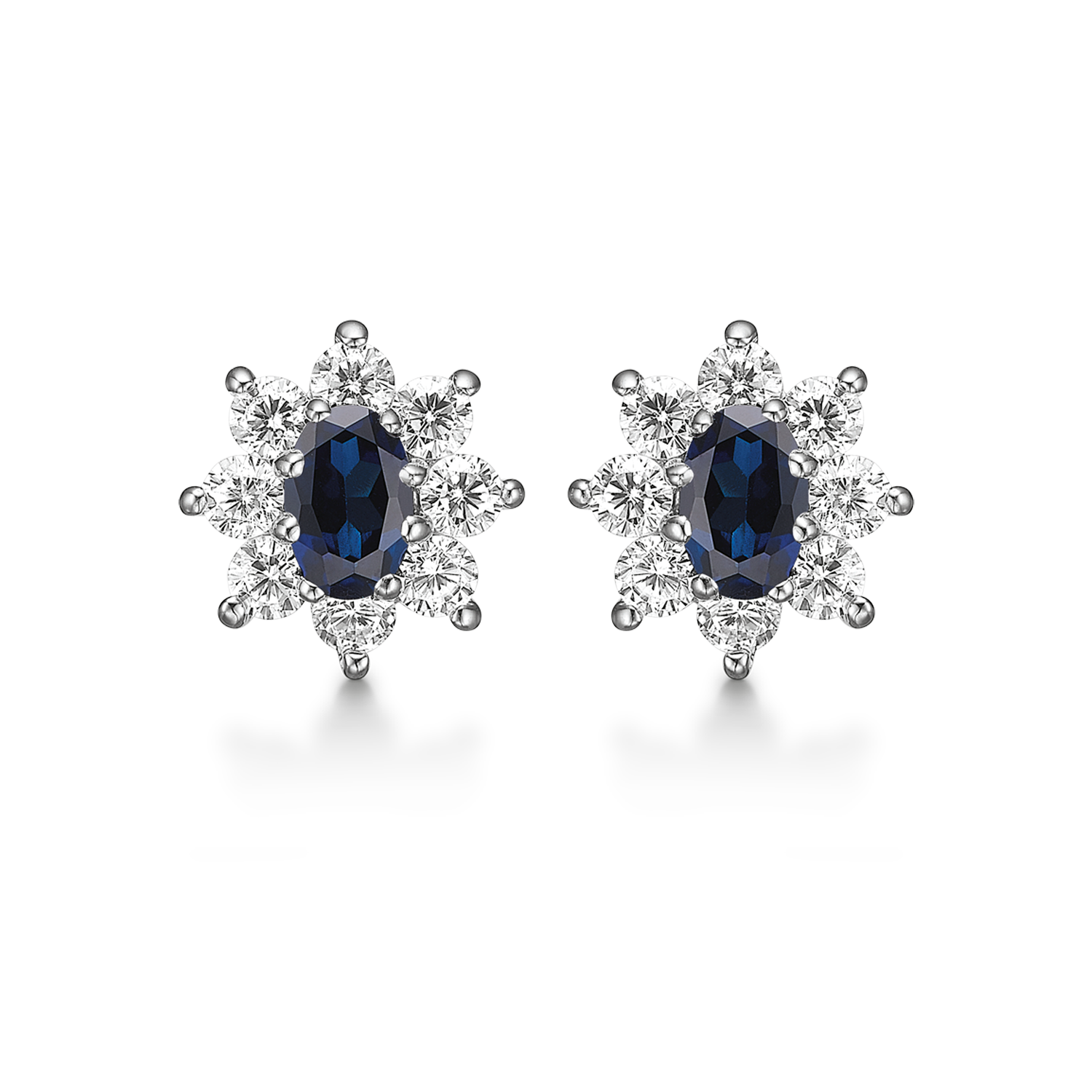 Silverörhänge rodiumpläterad oval syntetisk safir med 8 facetterade zirkoner runt om.