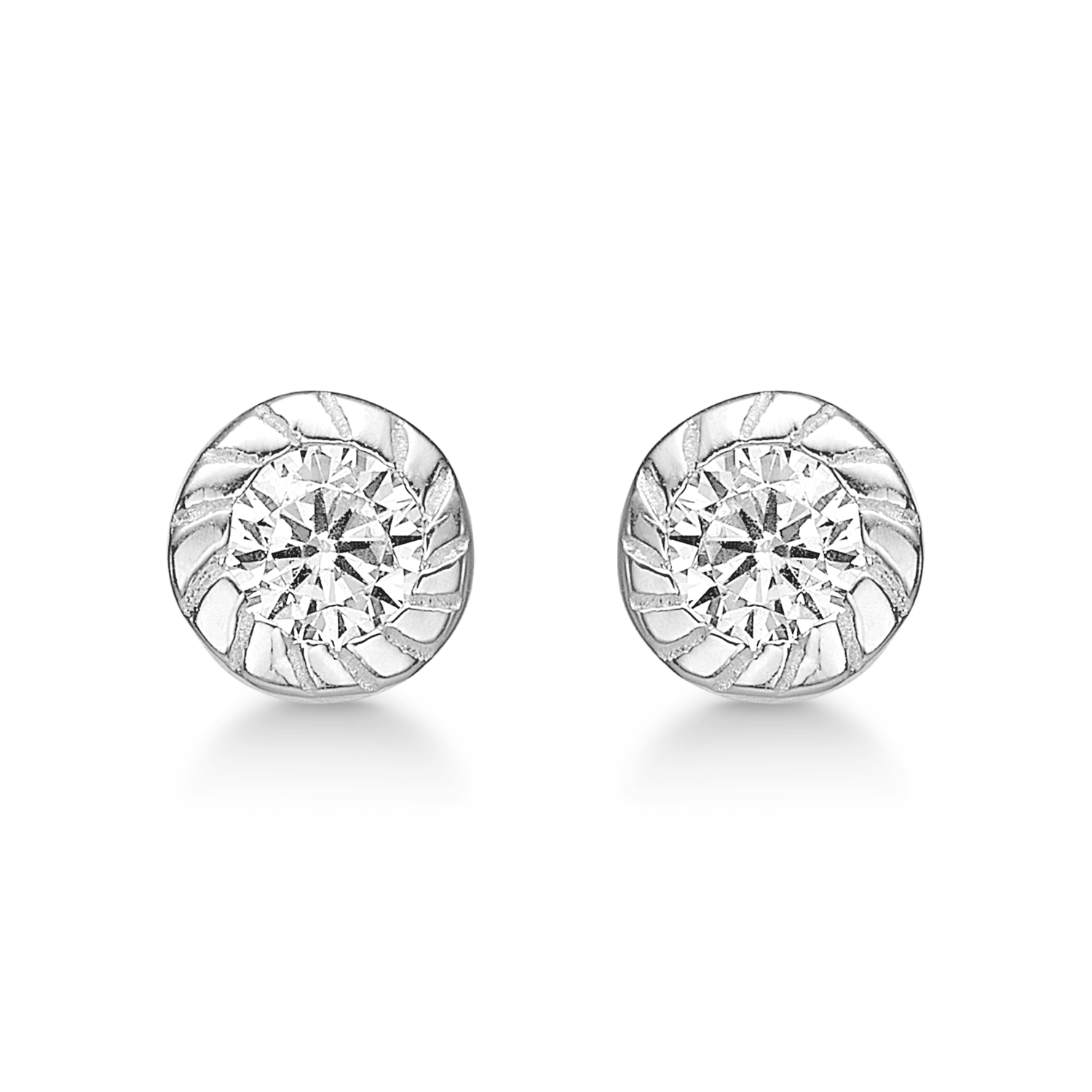 Öronproppar i silver, facetterad zirkon i rörformad infattning med mönster på kanten.