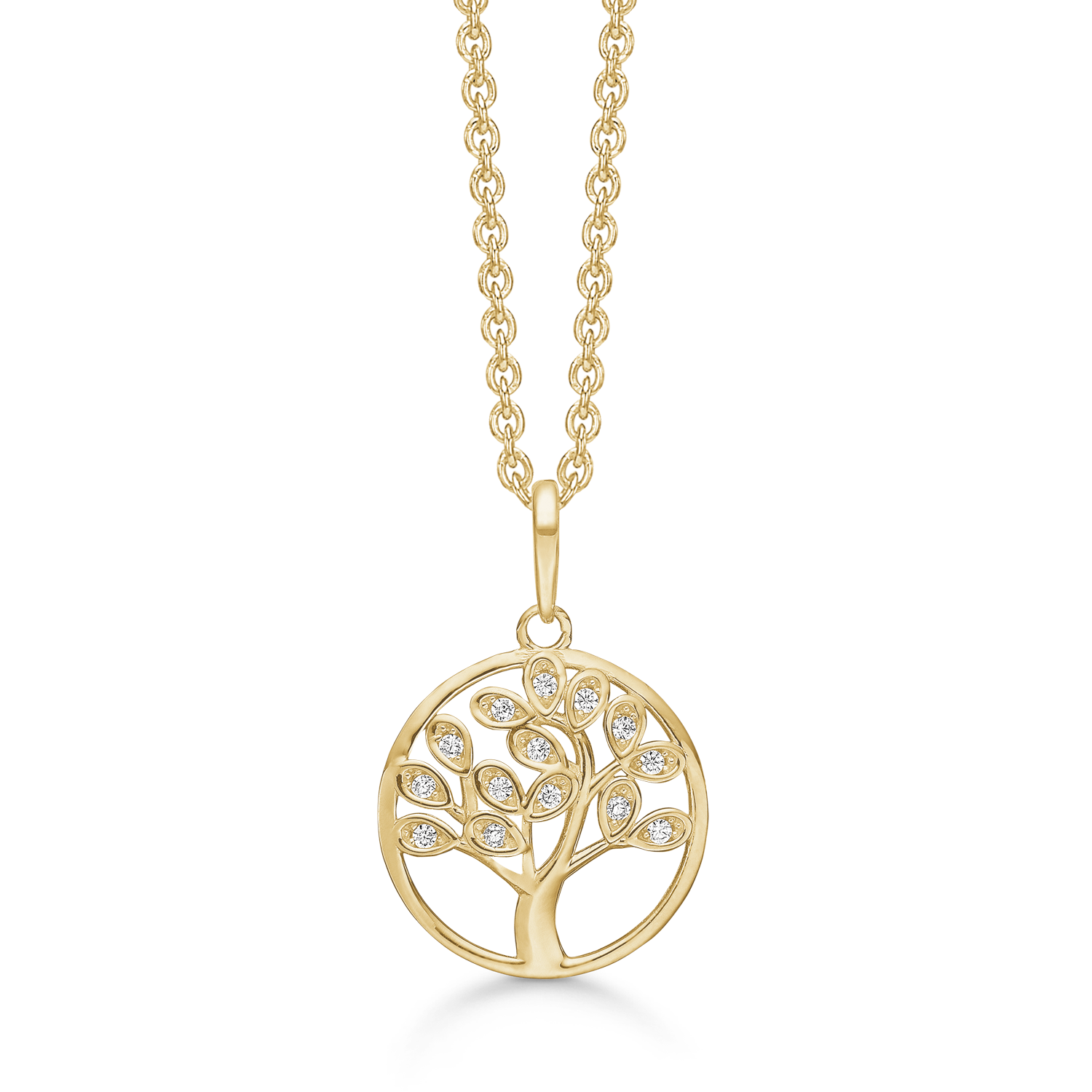 Støvring livets trädhalsband i 8 karat guld, med zirkonstenar – 42-45 cm Livets träd Halsband i rent 8 karat guld, från danska Støvring. Livets träd guldhalsband har fått en genompolerad yta. Ett glansigt lack både skyddar smyckets yta mot missfärgning och ger en läcker glansig look. Livets träd är dekorerad med vita zirkonstenar. Halsbandet är silverpläterat och har en längd på 42-45 cm. Hängets mått: 20,96 x 13,67 mm.
