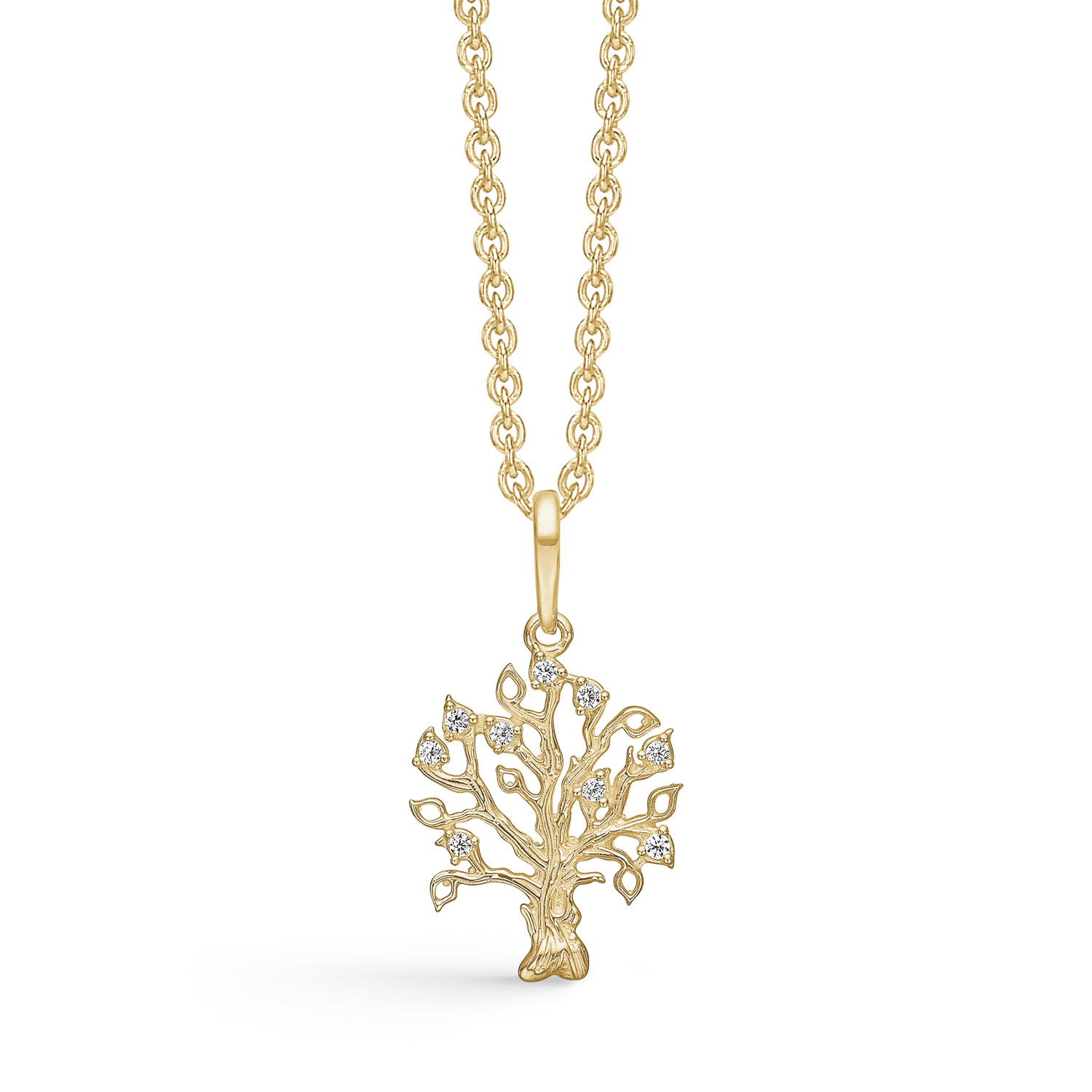 Støvring livets trädhalsband i 8 karat guld, med zirkonstenar – 42-45 cm Livets träd Halsband i rent 8 karat guld, från danska Støvring. Livets träd guldhalsband har fått en genompolerad yta. Ett glansigt lack både skyddar smyckets yta mot missfärgning och ger en läcker glansig look. Livets träd är dekorerad med vita zirkonstenar. Halsbandet är silverpläterat och har en längd på 42-45 cm. Hängets mått: 21,36 x 11,16 mm.