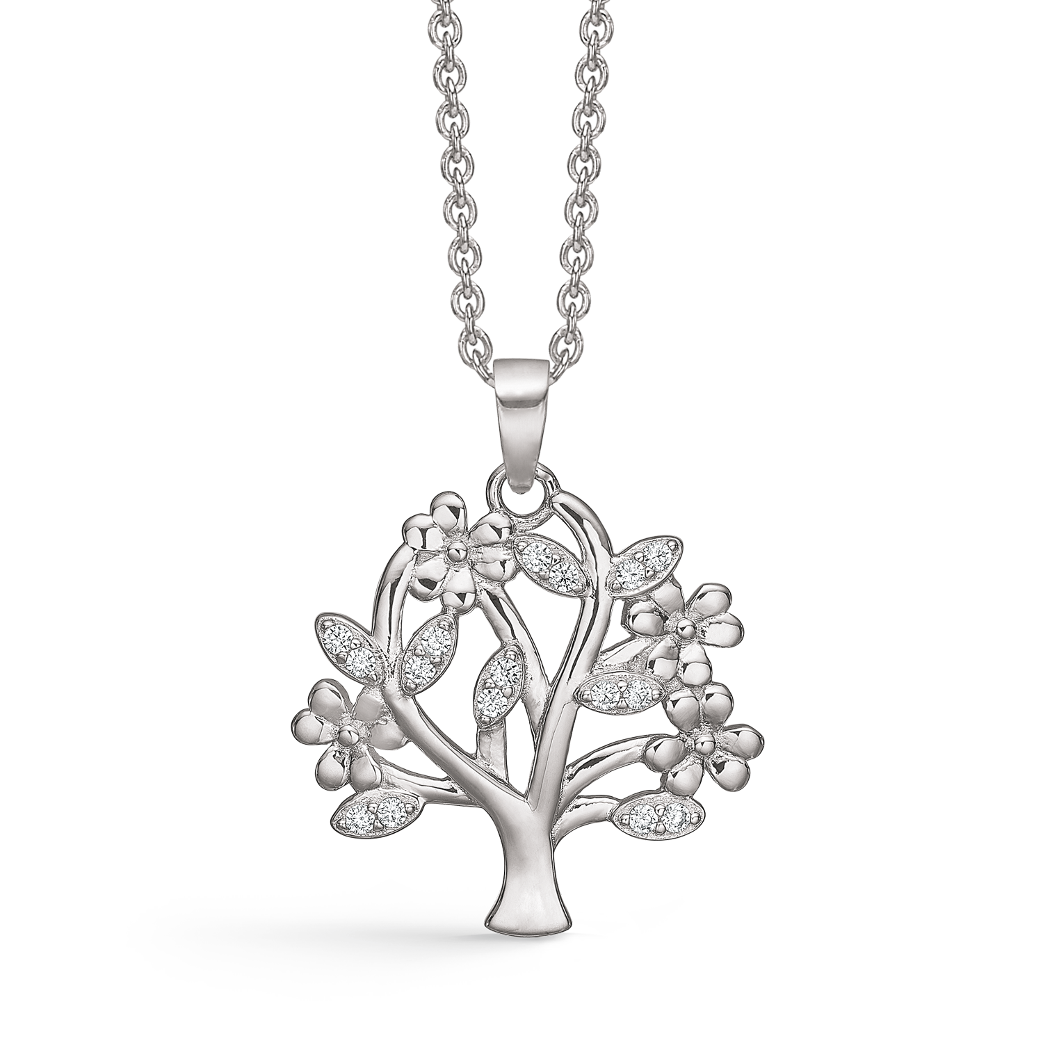 Støvring livets trädhalsband i silver, med zirkonstenar – 42-45 cm Halsbandet livets träd i silver, från danska Støvring. Halsbandet är belagt med skyddande rodium. En rodiumbeläggning ger pjäsen en glänsande yta och ett utseende som vitt guld. Dessutom ger en rodiumbeläggning också fördelen att smyckena inte missfärgas och gör ytan mer hållbar. Hänget är dekorerat med zirkonstenar och blommor Halsbandet har en längd på 42-45 cm.