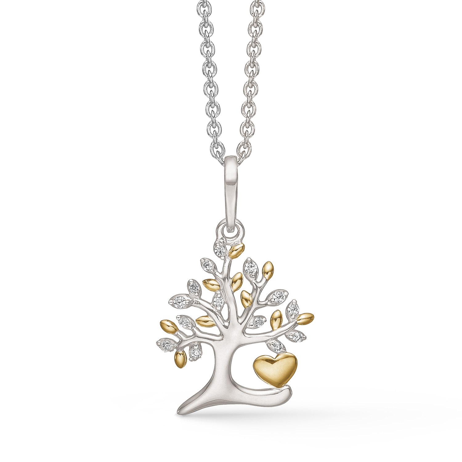 Støvring livets träd Halsband i silver och förgyllning, med zirkonstenar – 42+5 cm Livets träd Halsband i silver, från danska Støvring. Silverdelen av hängsmycken är belagd med skyddande rodium. Gulddelen är guldpläterad 18 karat, som är polerad. Ett glansigt lack både skyddar smyckets yta mot missfärgning och ger en läcker glansig look. Hänget är dekorerat med zirkonstenar. Halsbandet har en längd på 42 -45 cm.
