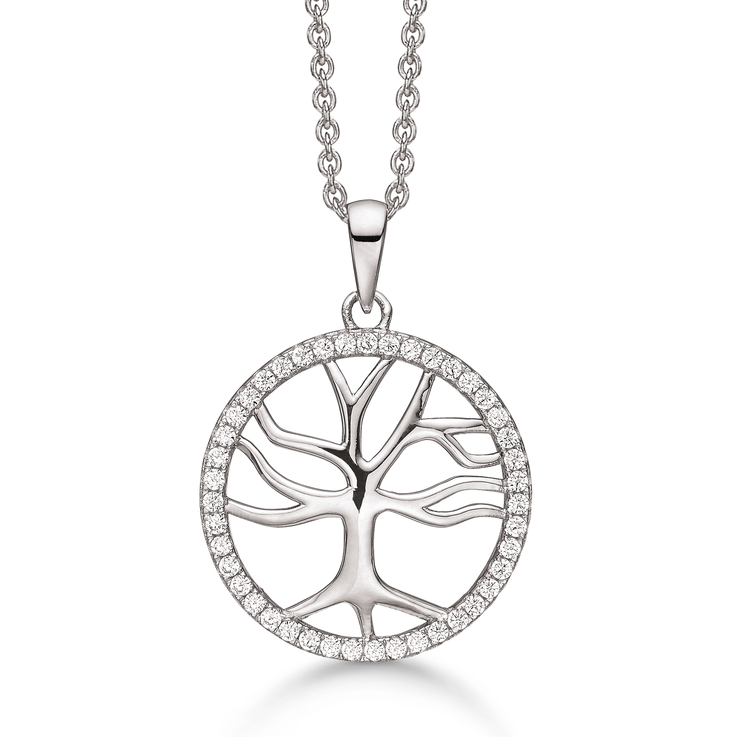 Støvring livets trädhalsband med zirkonstenar – 42-45 cm Livets träd Halsband i silver, från danska Støvring. Halsbandet är belagt med skyddande rodium. En rodiumbeläggning ger pjäsen en glänsande yta och ett utseende som vitt guld. Dessutom ger en rodiumbeläggning också fördelen att smyckena inte missfärgas och gör ytan mer hållbar. Hänget är dekorerat med zirkonstenar. Halsbandet har en längd på 42-45 cm.