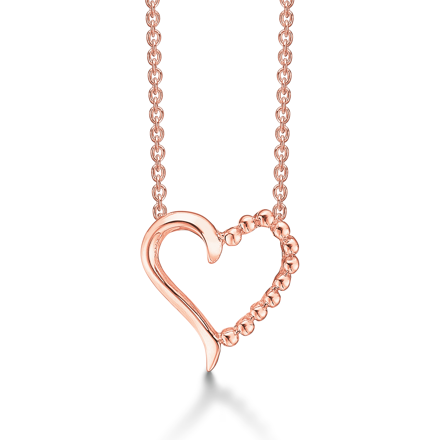 Støvring hjärthalsband i roséguldpläterat silver 42-45 cm Hjärthalsband i äkta roséguldpläterat silver. Dansk design från Støvring design. Ytan har polerats. Ett glansigt lack ger en blank yta. Dessutom skyddar den även smyckets yta. Det unika med detta halsband är att halva hjärtat är designat med små kulor. Vilket ger hjärthalsbandet en helt unik look. Kedjan har en justerbar längd på 42-45 cm, vilket säkerställer att kedjan passar alla.