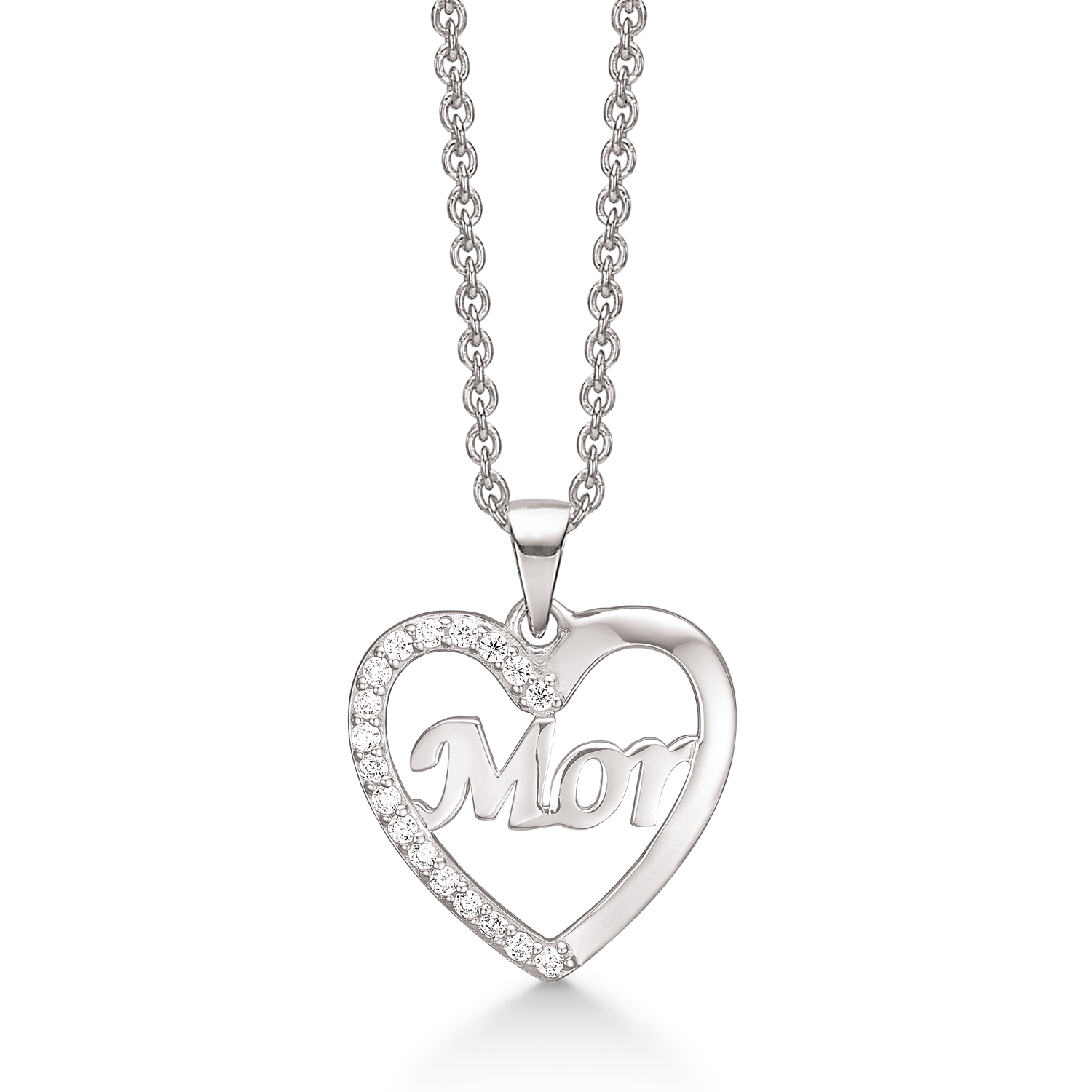 Støvring hjärta/mamma halsband i silver med zirconia stenar 42-45 cm Hjärta/mamma halsband i Silver. Dansk design från Støvring design. Hjärt-/mammahalsbandet är gjort av 925 sterling silver. Är belagd med rodium vilket skyddar ytan mot slitage och ger en fin blank silveryta Hjärthänget är dekorerat med vita zirconia stenar Kedjan har en justerbar längd på 42-45 cm vilket ser till att kedjan passar alla .