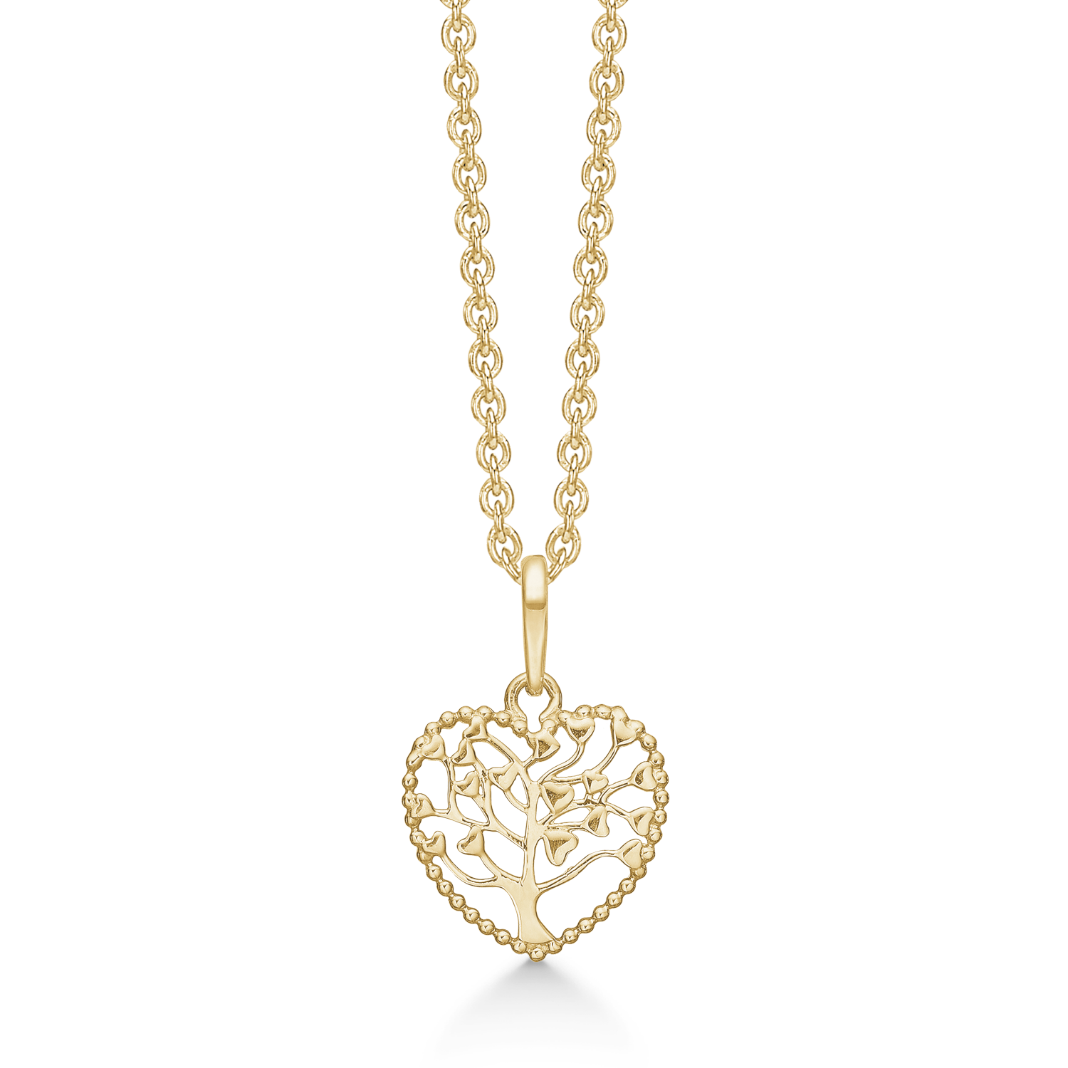 Støvring livets träd/Hjärtahalsband i 8 karat guld 42-45 cm Livets träd Halsband i rent 8 karat guld, från danska Støvring. Livets träd guldhalsband har fått en genompolerad yta. Ett glansigt lack både skyddar ytan på smyckena mot missfärgning och ger en läcker glänsande look. Livets träd är dekorerad med löv som hjärtan. Halsbandet är silverpläterat och har en längd på 42-45 cm. Hängets mått: 18,32 x 11,19 mm.