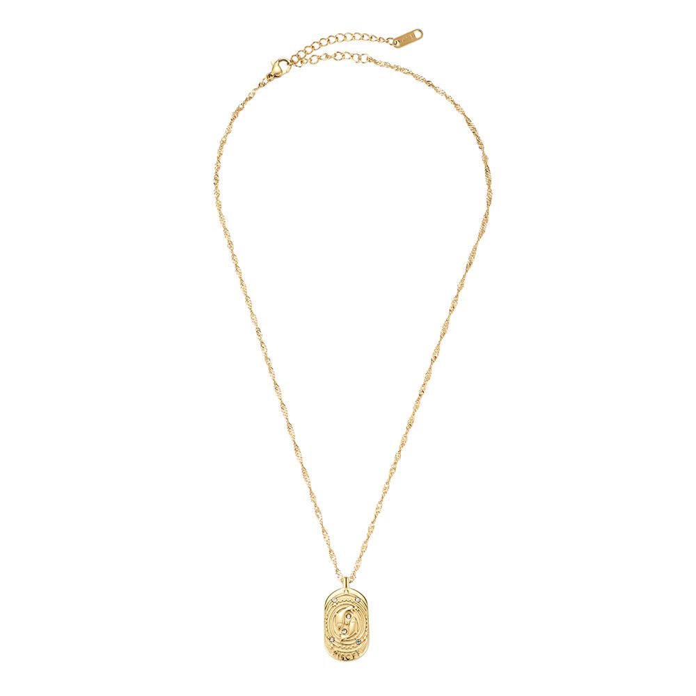 Zodiachalsband Fiskarna 14 karat guldpläterat med zirkonstenar 40+7 cm Halsband med Fiskarnas stjärntecken. Zodiac-halsbandet med Fiskarna är designat i rostfritt stål, som tål vatten och är ett extremt hållbart material. Ytan är polerad, med små matta detaljer vilket vi tycker ger ett otroligt snyggt utseende. Hänget har en rektangulär form och är dekorerad med vita zirkonstenar, som glittrar vackert, som små stjärnor. Kedjan har en längd på 40 cm och kan justeras med + 7 cm. Zodiac-hänget mäter 20×13 mm