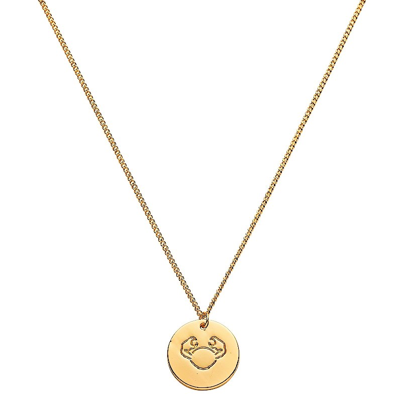 Stjärnteckenhalsband kräftan 14 karat guldpläterad 45cm Halsband med kräftans stjärntecken. Zodiac-halsbandet med kräftorna är designat i rostfritt stål, som tål vatten och är ett extremt hållbart material. Ytan är belagd med 14 karats guld som har polerats. Kedjan har en längd på 40 cm och kan justeras med + 5 cm. Stjärnhänget mäter Ø15 mm